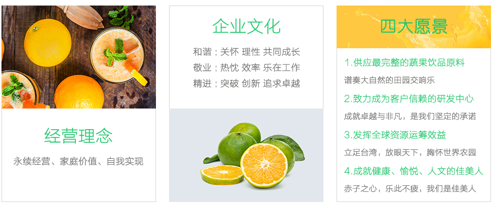 我們秉承著專業(yè)技術(shù)及嚴(yán)謹(jǐn)?shù)慕?jīng)營態(tài)度,在不斷地鉆研、開發(fā)與創(chuàng)新下,成功地將四季水果的新鮮風(fēng)味與營養(yǎng)長期完整的保存。十月份果實成熟后,我們將最新鮮的果實用最天然的方式加工成果汁。